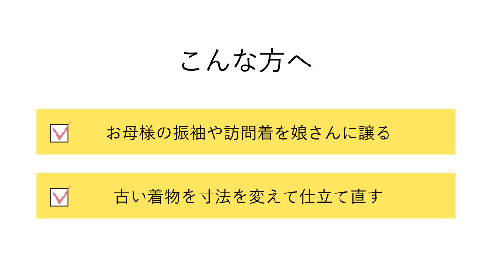 お母さまやおばあさまの古い着物もあなたの寸法で新品のように蘇ります。