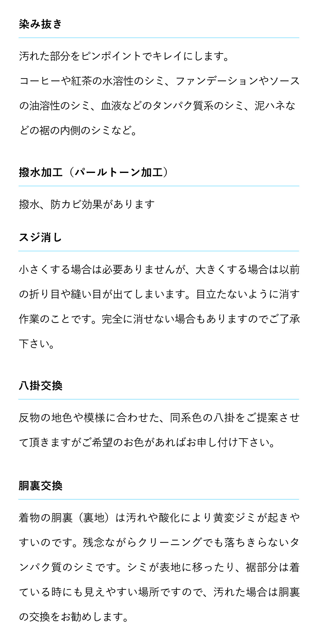 シミ抜きやパールトーン加工は別料金になります。