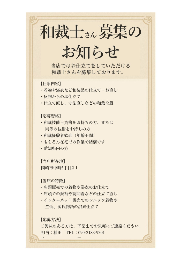 和物屋ほながは、愛知県岡崎市の振袖やお着物の販売やお仕立て直しをする着物専門店です。
